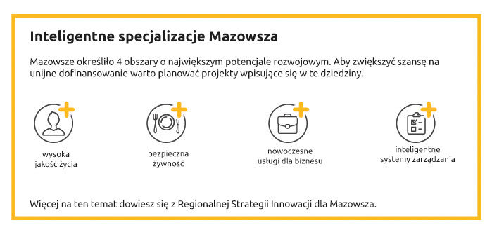 Region koncentruje się na utrzymaniu pozycji lidera gospodarczego w kraju. Ma też ambicje do konkurowania z innymi regionami Europy. Zgodnie z rankingiem Regional Innovation Scoreboard 2014 r. województwo jest umiarkowanym innowatorem. Aby dołączyć do grona najbardziej innowacyjnych regionów w UE władze Mazowsza skierują wsparcie na rzecz budowania mocnych stron województwa. W tym dużą rolę odegrają fundusze unijne.