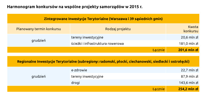 Zaplanowane są także specjalne pule środków na wspólne inwestycje samorządów z Warszawy i 39 okolicznych gmin (w ramach Zintegrowanych Inwestycji Terytorialnych) i pozostałych miast, stolic subregionów województwa mazowieckiego wraz z okolicznymi gminami i powiatami (w ramach Regionalnych Inwestycji Terytorialnych). Wspólne projekty wpłyną na poprawę komfortu życia mieszkańców. Na ten rok zaplanowane są nabory wniosków na ponad 450 ml zł. Zgłaszać będzie można tylko projekty zaplanowane w strategii Zintegrowanych Inwestycji Terytorialnych (ZIT) oraz planach inwestycyjnych pozostałych rejonów Mazowsza.