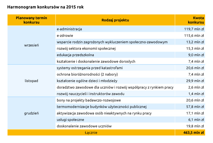 Pierwsze konkursy wystartują już jesienią bieżącego roku. Nabory dotyczyć będą wprowadzenia e-usług w administracji, ekonomii społecznej, aktywizacji społeczno-zawodowej, edukacji przedszkolnej i kształcenia zawodowego dorosłych. W grudniu tego roku rozpocznie się nabór projektów na bony innowacyjne dla mikro, małych i średnich przedsiębiorstw. Będą fundusze także na przedszkola i zajęcia dodatkowe dla młodzieży.