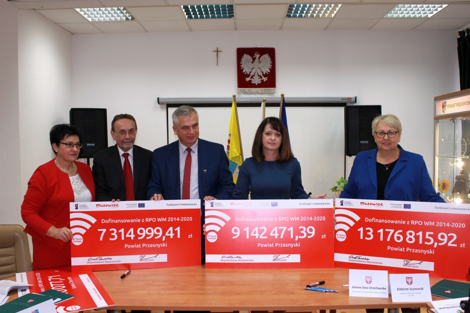 Już niebawem do powiatu przasnyskiego trafi blisko 30 mln zł wsparcia unijnego. Ponad 13 mln zł zostanie przeznaczone na utworzenie Edukacyjnego Inkubatora Przedsiębiorczości w Zdziwóju Nowym i Zdziwóju Starym, a w budynku Starostwa Powiatowego w Przasnyszu dzięki ponad 7,3 mln zł powstanie Centrum Aktywizacji Biznesu. Kolejne 9,1 mln zł z funduszy pozwolą na kompleksowe uzbrojenie terenów inwestycyjnych w północnej części powiatu przasnyskiego. Natomiast gmina Chorzele przeznaczy ponad 400 tys. zł z UE na budowę Punktu Selektywnej Zbiórki Odpadów Komunalnych. Umowy w tej sprawie podpisali wicemarszałek Janina Ewa Orzełowska oraz beneficjenci.