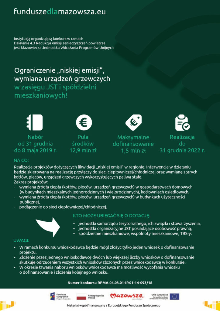 Fundusze europejskie z Regionalnego Programu Operacyjnego Województwa Mazowieckiego 2014-2020 wspierają zmniejszanie zanieczyszczenia powietrza. Do 8 maja samorządy, ale też wspólnoty i spółdzielnie mieszkaniowe mogą ubiegać się o dofinansowanie wymiany starych pieców na bardziej efektywne energetycznie i przyjazne dla środowiska. Konkurs ogłosiła Mazowiecka Jednostka Wdrażania Programów Unijnych.